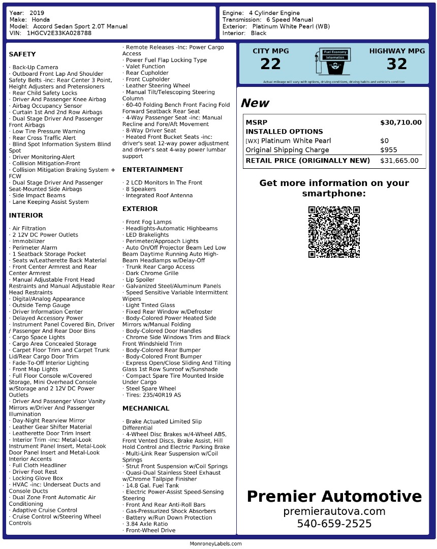 • At Premier Automotive Inc., one of the largest pre-owned car dealerships in the DMV area, we proudly offer over 300 vehicles in stock, providing a wide selection for our customers. While we strive to provide accurate vehicle information, some details—including window sticker features and vehicle history—may be sourced from third-party providers such as Monroney Labels, auctions, and vehicle data services. Because of this, customers are responsible for verifying all details prior to purchase. We strongly recommend contacting us directly to confirm vehicle specifications, features, and availability.