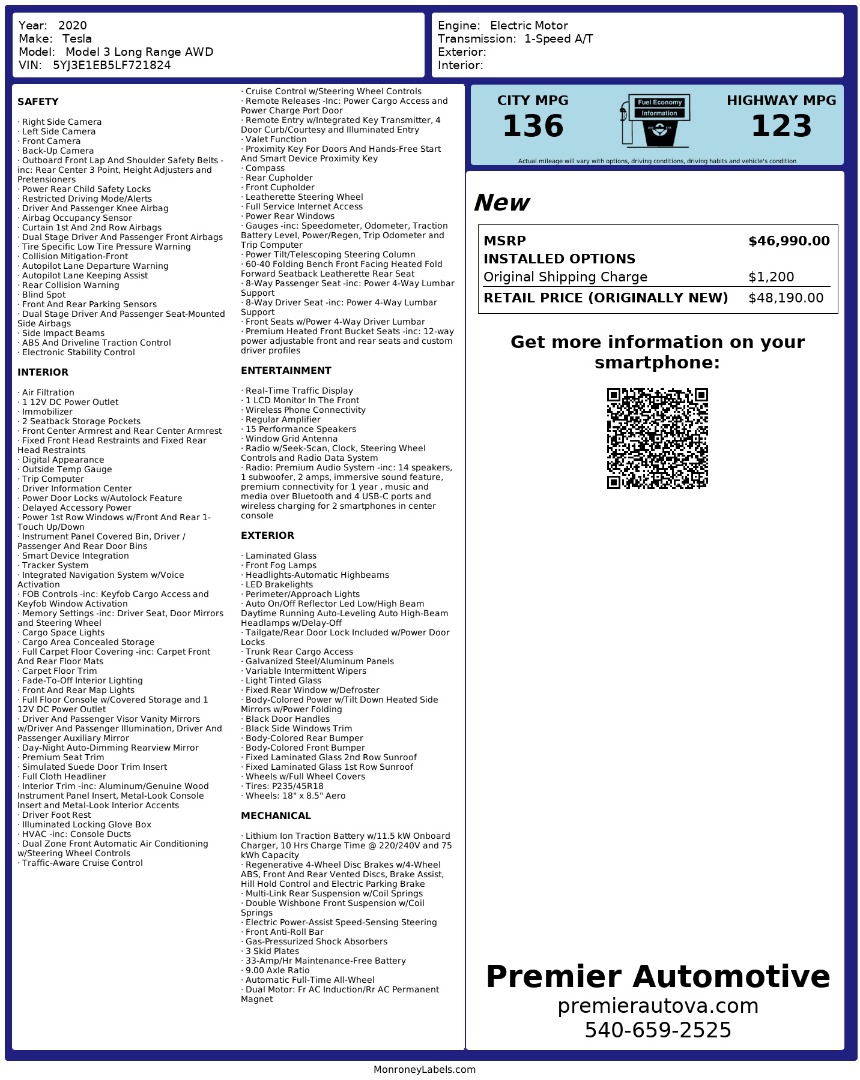 • At Premier Automotive Inc., one of the largest pre-owned car dealerships in the DMV area, we proudly offer over 300 vehicles in stock, providing a wide selection for our customers. While we strive to provide accurate vehicle information, some details—including window sticker features and vehicle history—may be sourced from third-party providers such as Monroney Labels, auctions, and vehicle data services. Because of this, customers are responsible for verifying all details prior to purchase. We strongly recommend contacting us directly to confirm vehicle specifications, features, and availability.
