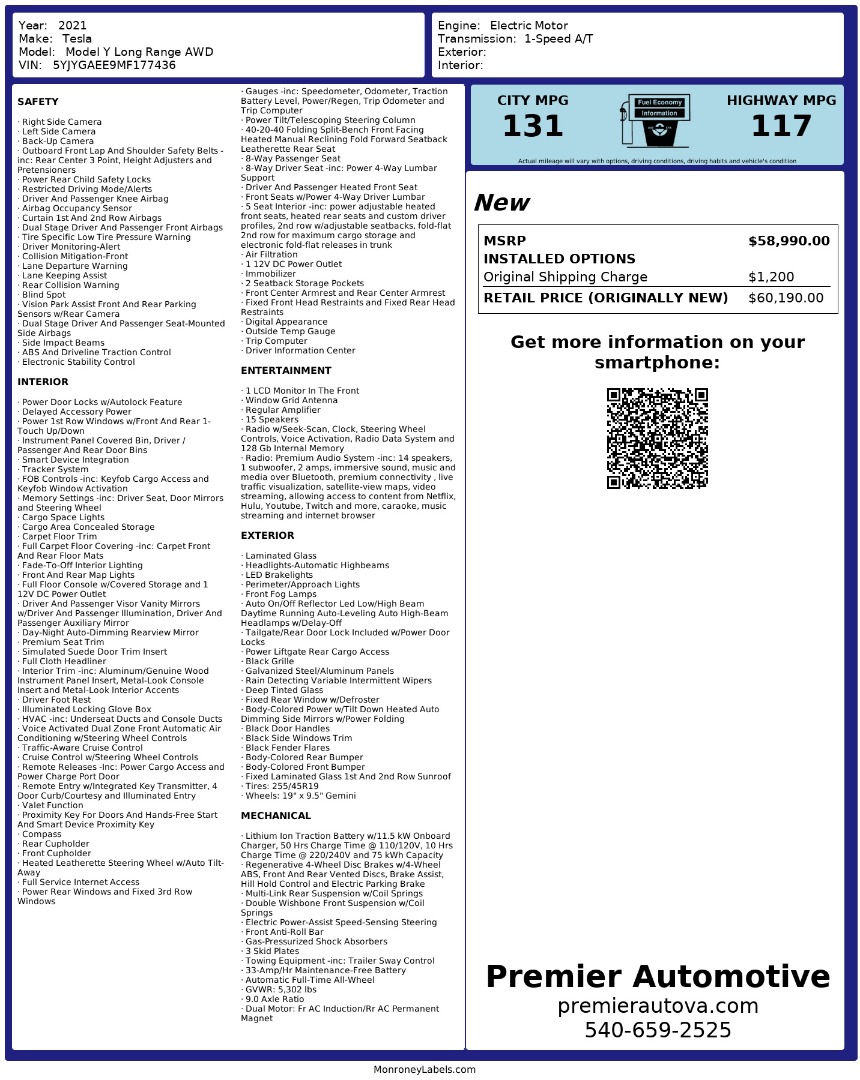 • At Premier Automotive Inc., one of the largest pre-owned car dealerships in the DMV area, we proudly offer over 300 vehicles in stock, providing a wide selection for our customers. While we strive to provide accurate vehicle information, some details—including window sticker features and vehicle history—may be sourced from third-party providers such as Monroney Labels, auctions, and vehicle data services. Because of this, customers are responsible for verifying all details prior to purchase. We strongly recommend contacting us directly to confirm vehicle specifications, features, and availability.