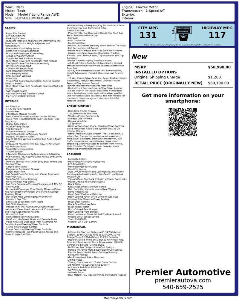 • At Premier Automotive Inc., one of the largest pre-owned car dealerships in the DMV area, we proudly offer over 300 vehicles in stock, providing a wide selection for our customers. While we strive to provide accurate vehicle information, some details—including window sticker features and vehicle history—may be sourced from third-party providers such as Monroney Labels, auctions, and vehicle data services. Because of this, customers are responsible for verifying all details prior to purchase. We strongly recommend contacting us directly to confirm vehicle specifications, features, and availability.