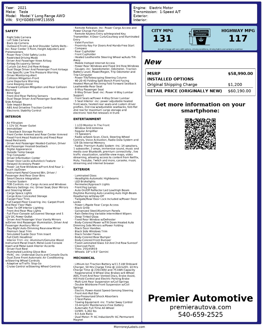 • At Premier Automotive Inc., one of the largest pre-owned car dealerships in the DMV area, we proudly offer over 300 vehicles in stock, providing a wide selection for our customers. While we strive to provide accurate vehicle information, some details—including window sticker features and vehicle history—may be sourced from third-party providers such as Monroney Labels, auctions, and vehicle data services. Because of this, customers are responsible for verifying all details prior to purchase. We strongly recommend contacting us directly to confirm vehicle specifications, features, and availability.