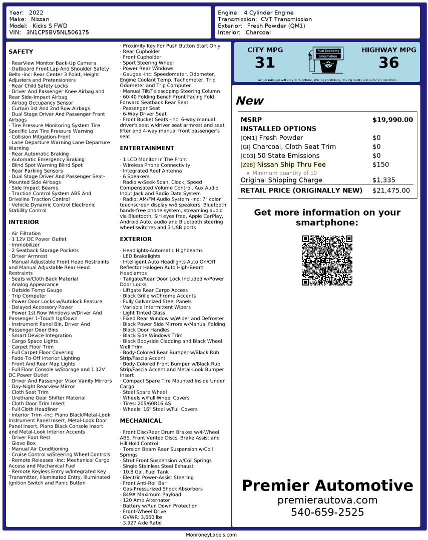 • At Premier Automotive Inc., one of the largest pre-owned car dealerships in the DMV area, we proudly offer over 300 vehicles in stock, providing a wide selection for our customers. While we strive to provide accurate vehicle information, some details—including window sticker features and vehicle history—may be sourced from third-party providers such as Monroney Labels, auctions, and vehicle data services. Because of this, customers are responsible for verifying all details prior to purchase. We strongly recommend contacting us directly to confirm vehicle specifications, features, and availability.