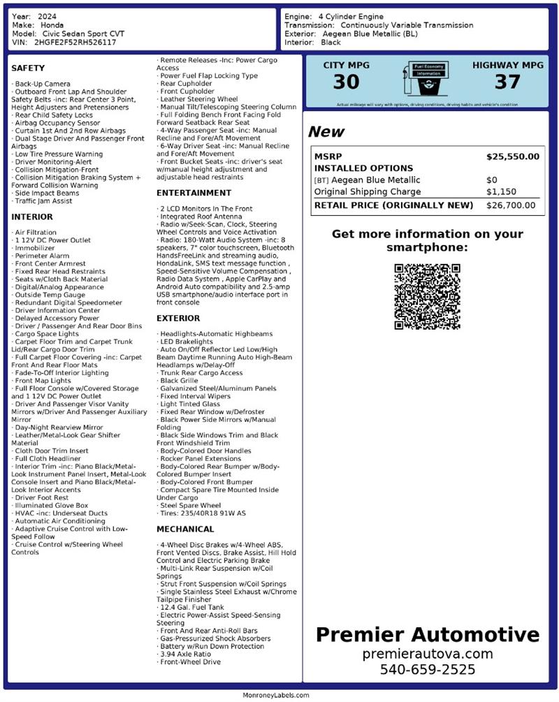 • At Premier Automotive Inc., one of the largest pre-owned car dealerships in the DMV area, we proudly offer over 300 vehicles in stock, providing a wide selection for our customers. While we strive to provide accurate vehicle information, some details—including window sticker features and vehicle history—may be sourced from third-party providers such as Monroney Labels, auctions, and vehicle data services. Because of this, customers are responsible for verifying all details prior to purchase. We strongly recommend contacting us directly to confirm vehicle specifications, features, and availability.