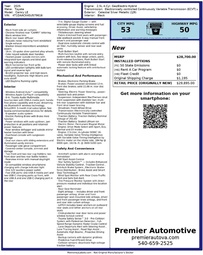 • At Premier Automotive Inc., one of the largest pre-owned car dealerships in the DMV area, we proudly offer over 300 vehicles in stock, providing a wide selection for our customers. While we strive to provide accurate vehicle information, some details—including window sticker features and vehicle history—may be sourced from third-party providers such as Monroney Labels, auctions, and vehicle data services. Because of this, customers are responsible for verifying all details prior to purchase. We strongly recommend contacting us directly to confirm vehicle specifications, features, and availability.